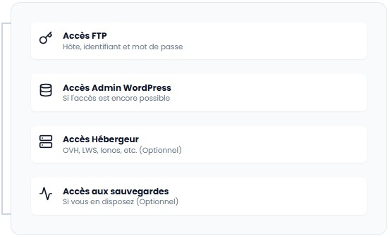 Afin que nous puissions contrôler tous les points utiles, consulter les logs d’erreur et trouver l’origine de la panne, nous avons besoin des accès listés ci-contre.